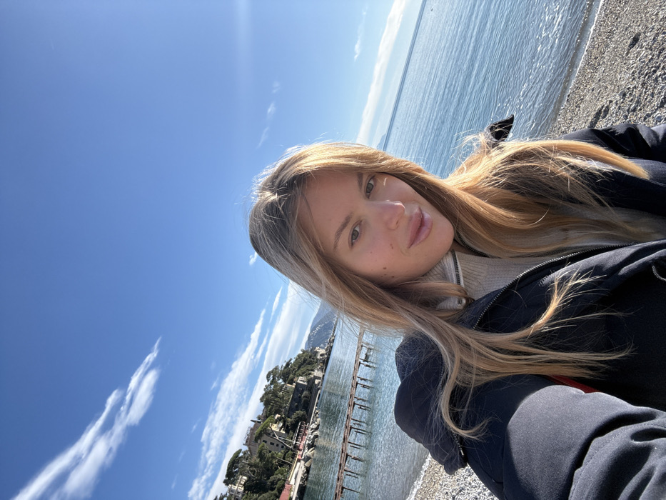 A young adult female with fair complexion and long, wavy blonde hair is captured in a selfie-style photograph. She is looking directly at the camera with a slight smile, wearing a dark-colored puffer jacket over a light-colored turtleneck sweater. The scene is set on a pebbled beach adjacent to calm, blue-green sea water. In the background to the left, a partially submerged wooden pier structure extends into the water. Behind the pier and beach, green, tree-covered hills rise, featuring several multi-story buildings with light facades and red-tiled roofs nestled amongst the vegetation. The right side of the frame shows the sea extending towards the horizon under a clear blue sky with sparse, wispy white clouds. Distant landmasses are faintly visible on the far right horizon. The scene is illuminated by bright, natural daylight. This location is identified as the bay of San Michele di Pagana, a hamlet situated on the Ligurian coast of Italy, immediately adjacent to the city of Santa Margherita Ligure.