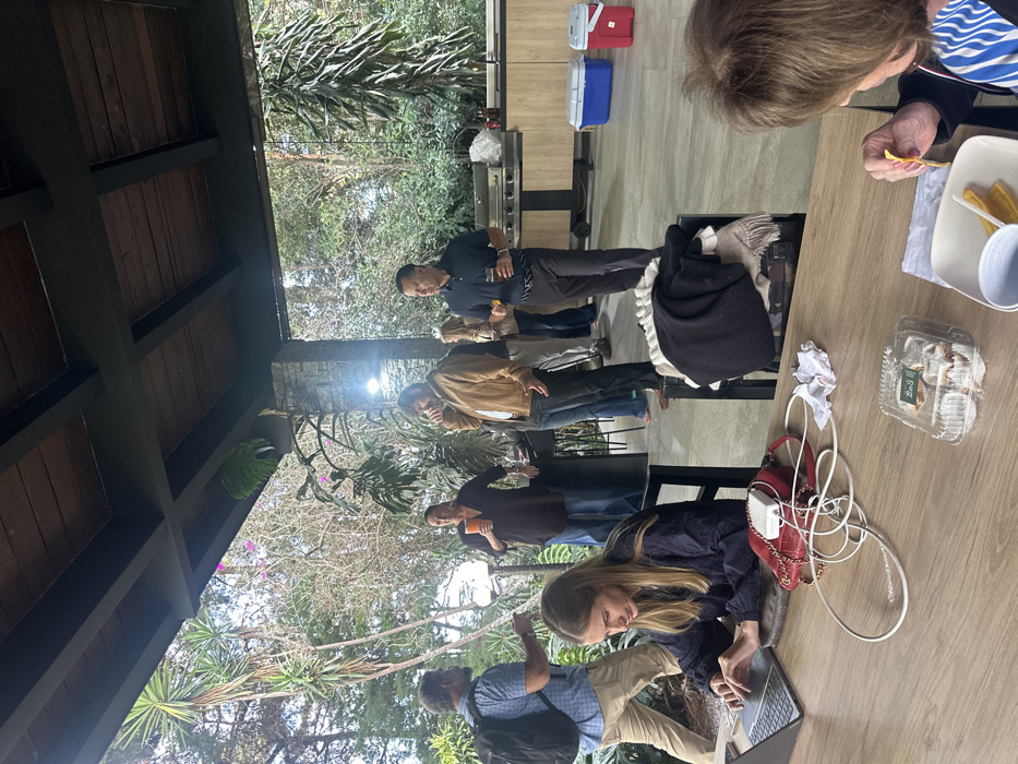 Under a wood-beamed structure, several people gather outside. A woman works on a laptop at a light-colored table cluttered with a purse, charger, and food containers. Other individuals stand in the background, some holding drinks, near a grill and coolers. Lush greenery is visible in the distance. Someone at the table eats plantain chips.