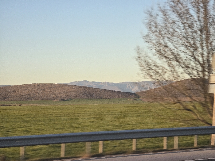 The image depicts a rural landscape near Polsko Padarevo, Bulgaria. In the foreground, an asphalt road surface is visible, bordered by a horizontal, two-bar metal guardrail. To the far right, a bare-branched tree, blurred by motion, partially obscures the scene. Beyond the guardrail, a wide, flat expanse of cultivated green field extends. Behind this field, a rounded, brown hill with sparse vegetation dominates the left-center, followed by another, darker brown hill to its right. In the distant background, a range of hazy, blue-grey mountains stretches across the horizon. The sky above is clear, exhibiting a gradient from light blue at the zenith to a pale yellow-orange near the horizon, indicative of late afternoon or early morning light. No people, animals, or man-made structures other than the road elements are present.