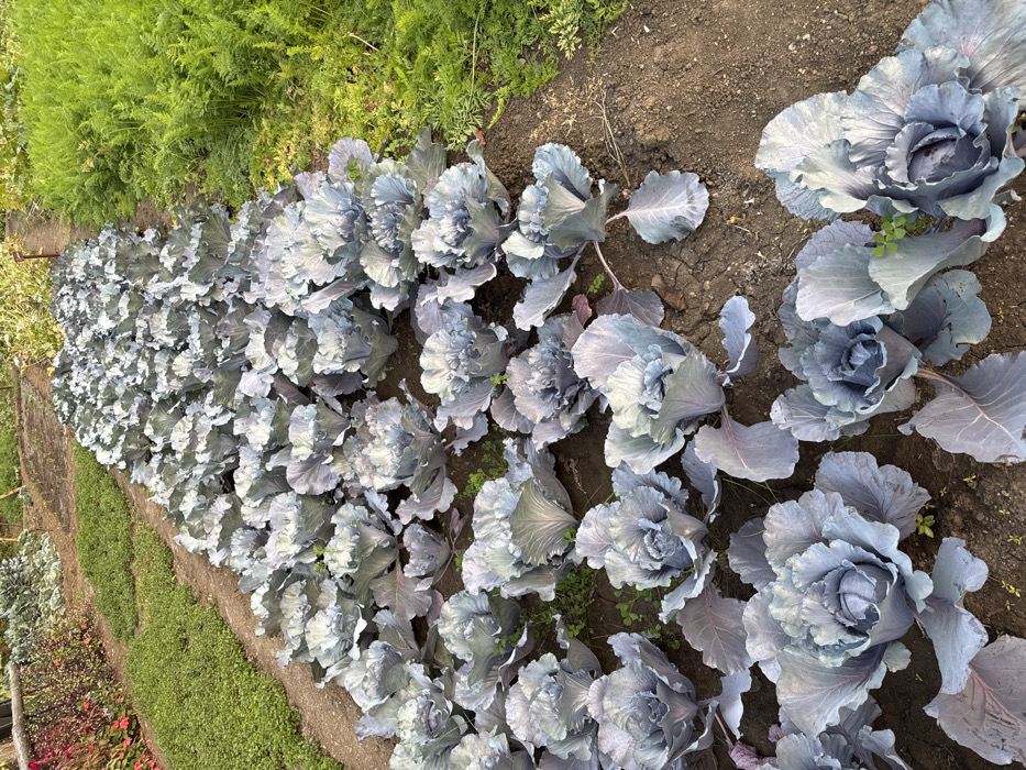 This image depicts a cultivated garden plot in Bhopal, India, showcasing multiple rows of vegetable crops under natural daylight. The primary subject is a long, slightly diagonal row of mature red cabbage plants, extending from the foreground towards the background, situated in a bed of dark brown, tilled soil. Each cabbage head exhibits a round form with distinct blue-green and purple-red leaves. To the immediate right of the red cabbage row is a dense bed of vibrant green, finely textured foliage, consistent with young carrot plants. To the left of the red cabbage row, a narrow dirt path separates it from another section of garden beds containing smaller, low-lying green plants, possibly herbs or leafy greens, and further left, beds with reddish foliage or flowering plants. A segment of a wooden fence or trellis is partially visible at the far upper-left. No individuals are present in the scene.