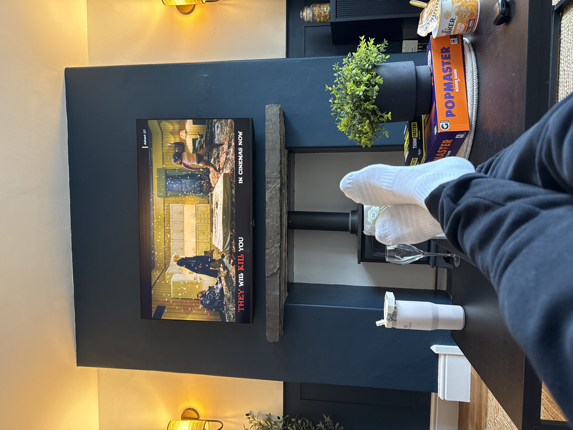 A person wearing white socks and a black sweater is watching the movie "They Will Kill You" on a television screen. The television is mounted on a wall above a decorative shelf holding a plant, glasses, and a white Stanley tumbler. On a nearby table are board games ("Pop Master", "Think Faster!"), a container of Golden Syrup, and a cup with a spoon. The wall is painted navy blue and has sconces above the television. The location is not explicitly defined in the image.
