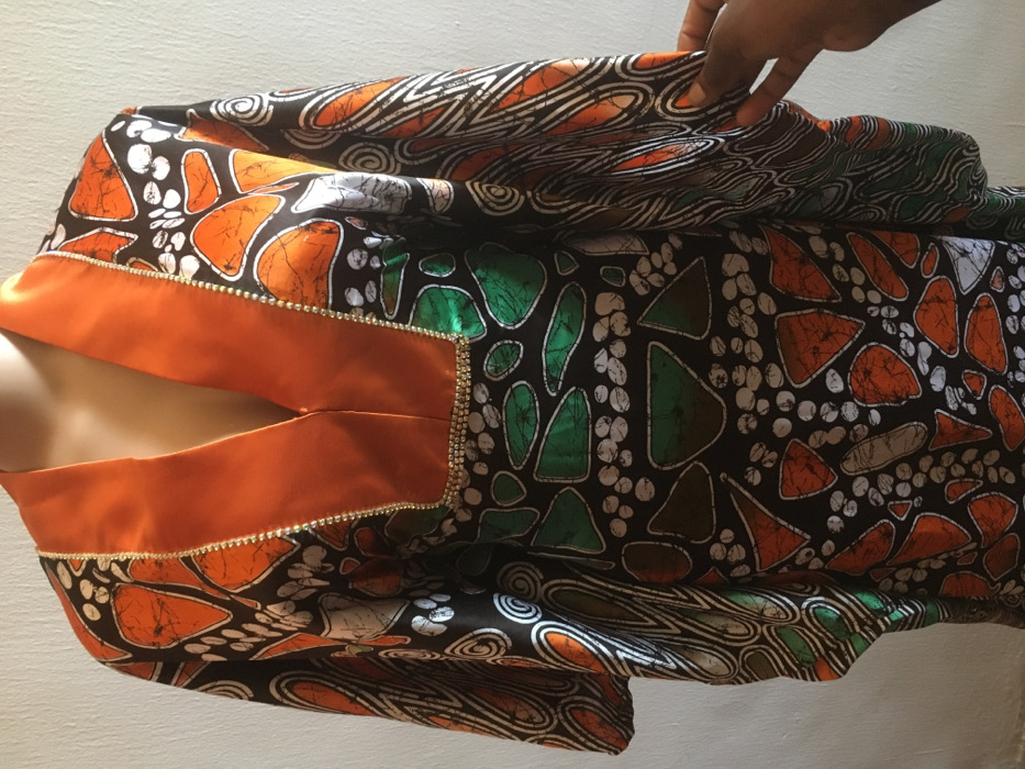 A vibrant, multi-patterned kaftan-style garment is displayed on a light-skinned mannequin torso against a plain, off-white wall in Jos, Nigeria. The fabric features an abstract batik-style design on a dark ground, incorporating irregular shapes and swirls in orange, green, and white. A wide, solid orange satin trim forms a V-neckline that extends into a U-shaped decorative element across the chest, bordered by a continuous line of small, clear rhinestones or beads. A dark-skinned human hand is visible in the lower right quadrant, gently gripping the fabric of the garment's right sleeve. The scene is indoors, uniformly lit.