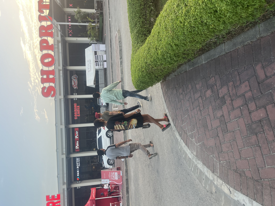 Four people walk along the sidewalk beside a shopping center with signs for restaurants like Pizza Rotti's, Pizza Piazza, and Soaring Eagle. The shopping center also features a red "SHOPRITE" sign. A hedge borders the walkway, and a brick path lies adjacent. A small tent with red promotional material is visible in the foreground. A white car is parked in front of the shopping center.