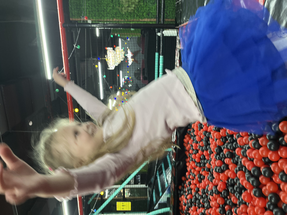 A young girl with blonde hair, wearing a pink long-sleeved shirt and blue skirt, appears to be in motion, possibly falling or diving. She is surrounded by a ball pit filled with red and black balls. In the background, there is indoor playground equipment, including a climbing structure, netting, and decorative lights. The photo seems to capture a moment of playful activity in an indoor play area.