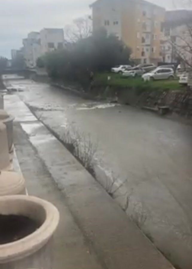 canal with murky, grey water flowing downstream. The canal is flanked by concrete embankments. On the left side, there are several large, empty, beige planters. On the right side, the embankment transitions into a natural bank with some small bushes growing. A row of buildings is visible in the background, including a yellow apartment building. Several cars are parked along the bank near the buildings. The sky is overcast, and the overall lighting is subdued.
