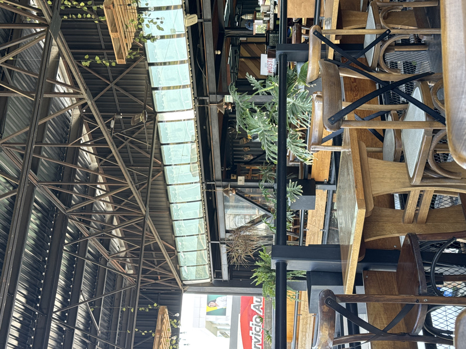 An interior view shows stacked wooden chairs and tables with metal frames, illuminated by overhead skylights. A complex metal framework supports the ceiling, and hanging plants provide decoration. A sign is visible in the background outside, suggesting a commercial or restaurant setting. The scene is filled with intricate structural details and natural elements.