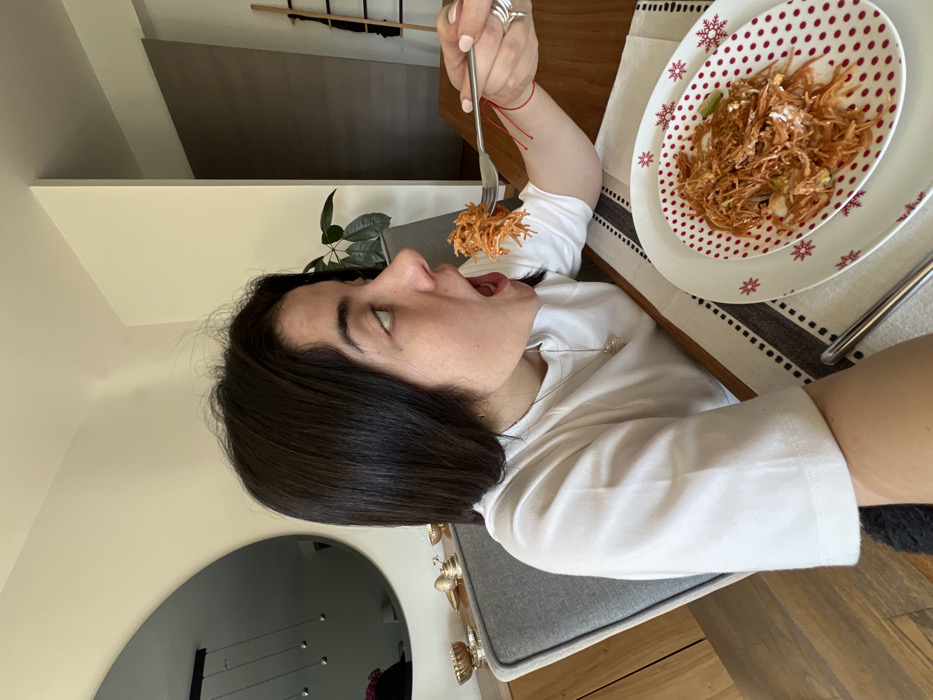 - "A woman with dark hair and a white shirt is eating noodles from a fork" by FM-sBHb22, licensed under CC BY 4.0