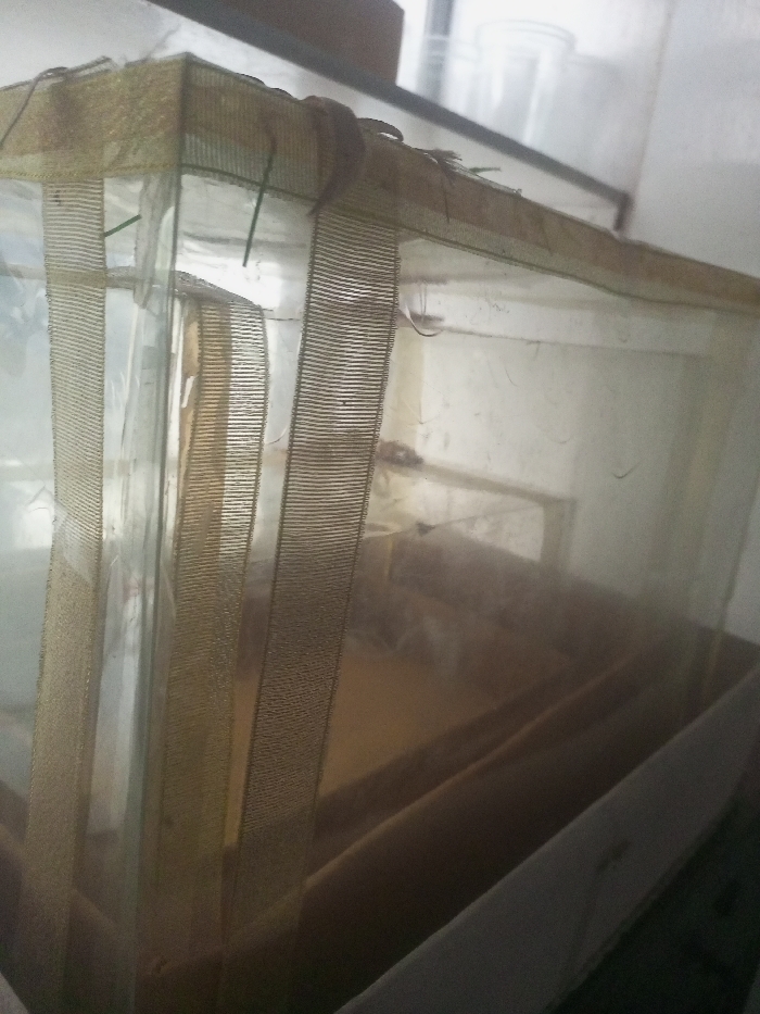 A transparent rectangular enclosure, composed of clear panels, is centrally positioned in an indoor setting in Zee Pin Kone, Myanmar. The enclosure's visible vertical and top horizontal edges are reinforced with a light brown, coarse mesh ribbon, which is secured by thin green wires at the upper corners. A dark, linear element rests along the top edge, partially obscured by the ribbon. The clear panels exhibit surface smudges, dust, and reflections. The interior floor of the enclosure appears light brown and indistinct. In the background, visible through the transparent panels, several clear glass or plastic vessels are discernible. The enclosure rests on a light-colored, flat surface in the foreground. No individuals, explicit actions, or interactions are depicted.