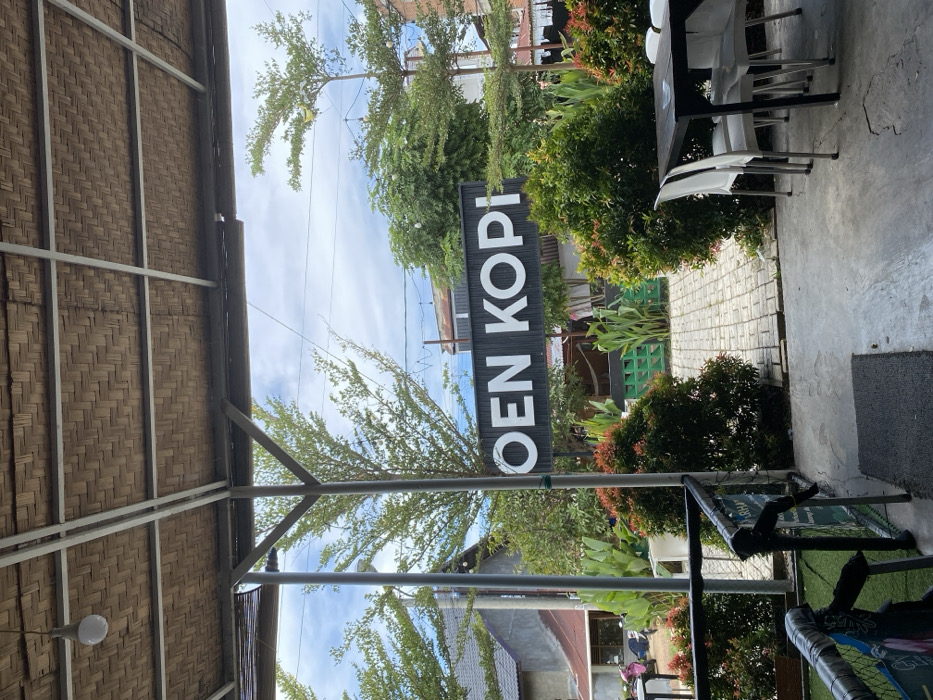 The image depicts an outdoor or semi-outdoor seating area of "OEN KOPI," a coffee shop located in Banda Aceh, Indonesia