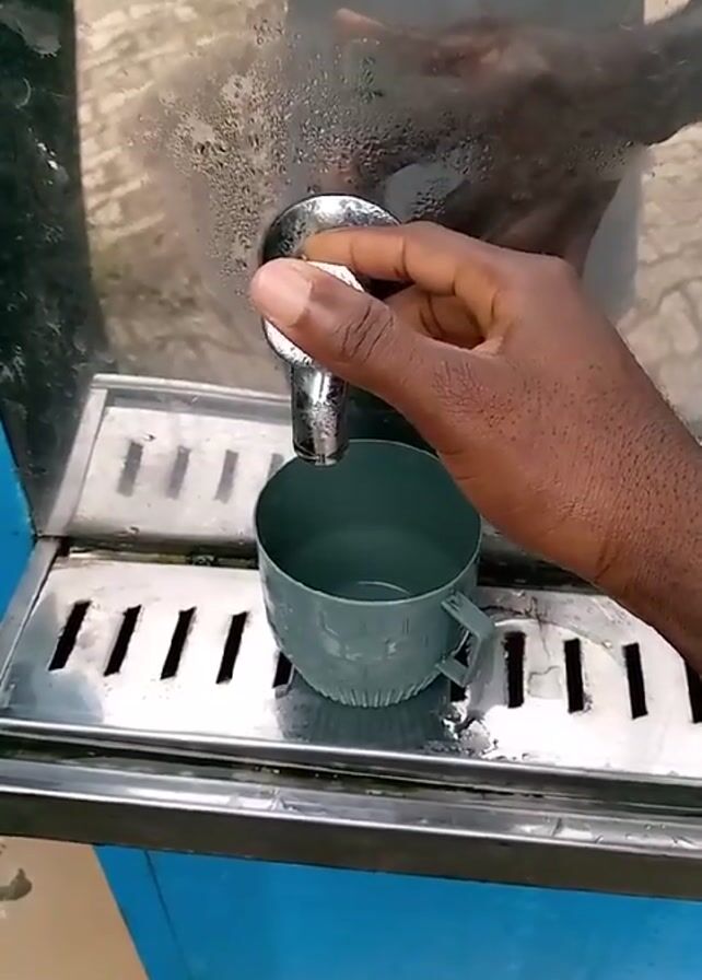 A person fills a gray plastic cup from a water dispenser. The dispenser has a blue base, a stainless steel platform with slots for drainage, and a mirrored glass front. The person uses their right hand to press the silver nozzle, causing water to flow into the cup. A reflection of another person wearing a white shirt and an ID badge is seen in the mirrored surface of the dispenser. The video begins with the sound of running water, and the person in the video starts by saying "Good morning everyone."