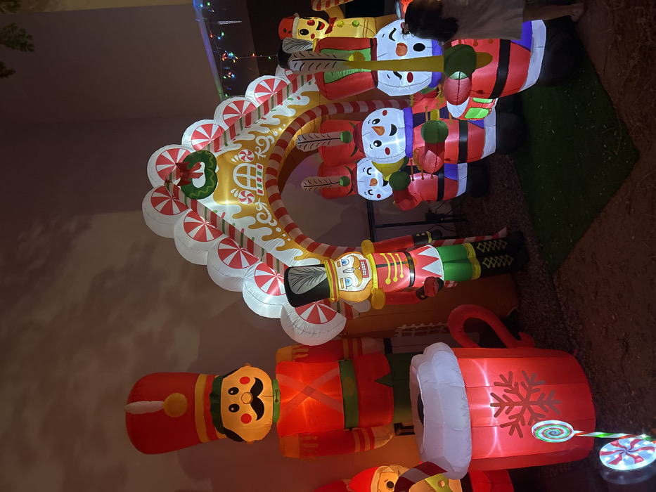 An outdoor display of inflatable Christmas decorations. There's a large gingerbread arch with candy cane trim and a wreath. Beneath the arch are stacked snowmen and a nutcracker. A separate nutcracker and a giant mug with a snowflake design and lollipops are also visible. The decorations are illuminated. A person is seen near the top of the image.