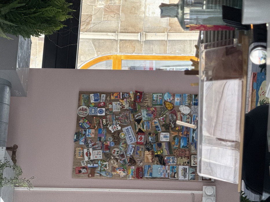 The image depicts an interior scene, likely a cafe or shop, with a view towards a wall and an exterior window. On the left, a pale pink wall features a large, rectangular wooden board densely covered with approximately 100-150 diverse travel souvenir magnets. Notable magnet designs include place names such as "TORINO," "LOS ANGELES," "NEW YORK," "ISTANBUL," "JAMAICA," "CANADA," "MALTA," "ARGENTINA," and "STRASBOURG," alongside depictions of landmarks, flags, and cultural motifs. Above the magnet board, an exposed galvanized metal duct system runs horizontally across the ceiling, from which a vine-like green plant hangs down the left wall. In the lower left foreground, two white circular electrical outlets are visible on the wall. A clear, rectangular plastic display case, resting on a wooden surface, occupies the bottom center of the frame, partially obscuring the lower section of the magnet board. To the right, a black-framed window offers a partial view of an exterior building. Through this window, a distinctive arched yellow window or door frame is visible against a facade of light-colored, rough-hewn stone blocks. A light-colored downspout runs vertically along the stone wall. From the upper right corner, another green plant, resembling a fern, hangs down into the frame. In the immediate foreground, a dark, reflective surface, likely a countertop, holds several objects. These include a clear glass bottle with a gray stopper on the right, and other blurred glass or ceramic items. No specific visual cues within the image definitively identify the location as Bad Nauheim, Germany.