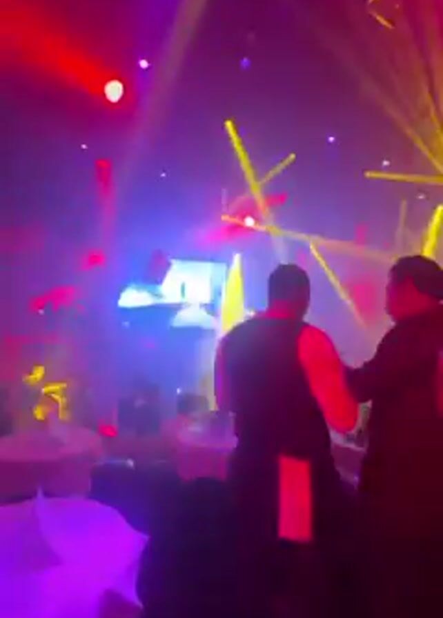 dimly lit nightclub or bar with colorful lighting, including red, blue, and yellow spotlights. There is a crowd of people, mostly seen in silhouette. A screen displays a figure, possibly a dancer or performer. People are standing and moving around in the space.