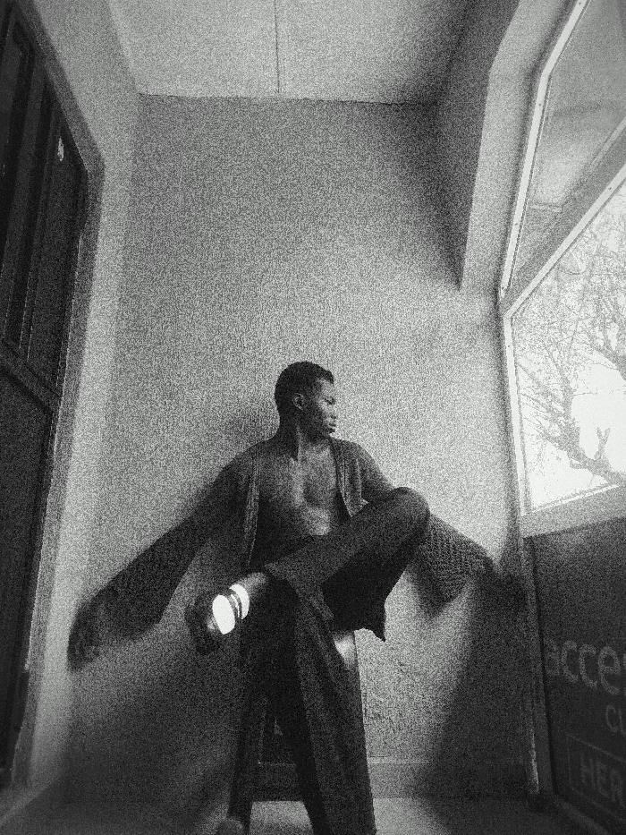 A black and white photograph, exhibiting considerable visual grain, captures an adult male within an indoor or semi-enclosed architectural space in Sabon Tasha, Nigeria. The male subject, shirtless and with dark skin, is seated on a low surface or stool. He leans against a textured wall, with both arms extended laterally, hands resting on adjacent walls. His left leg is crossed over his right at the knee, with the right foot on the ground. He wears dark trousers and an unbuttoned, long-sleeved cardigan draped over his shoulders. A bright, circular object is visible on his left ankle. The subject's gaze is directed towards the right. To the left of the frame, a dark door frame is visible. To the right, a large window reveals the silhouette of bare tree branches against a bright exterior. Adjacent to the window, a dark rectangular sign with partial light-colored text, including "access" and "HER," is visible at floor level.