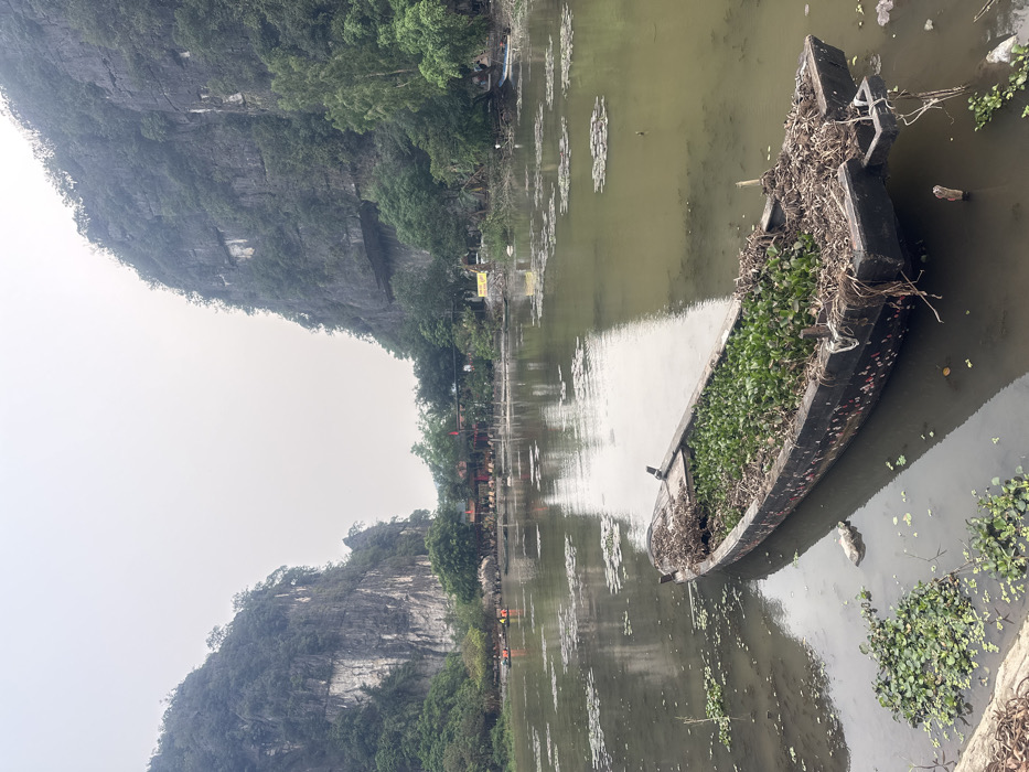 A wide-angle landscape photograph depicts a waterway within Nam Hoa Lư Ward, Vietnam, under an overcast sky. In the foreground, a dilapidated wooden boat, appearing dark brown or black with chipped paint, floats partially submerged in murky, greenish-brown water. The boat's interior is densely packed with bright green aquatic plants and dry, brown organic debris. Surrounding the boat and extending into the midground, the water surface is covered with scattered clusters of green lily pads and floating debris, including a visible plastic bottle. On the far bank, several buildings with red roofs are visible, interspersed with green trees and foliage. Red flags are affixed to poles near these structures. Yellow signs are also discernible on the bank, with one larger sign appearing to advertise "Canoeing." Multiple small, flat-bottomed boats are present on the water near the far bank, each containing one or more individuals wearing bright orange life jackets. These individuals appear to be passengers engaged in a tour. The background is dominated by imposing, steep karst limestone mountains rising on both sides of the waterway, covered in dense green vegetation with visible rock faces. The mountains frame the scene, narrowing the visible sky.