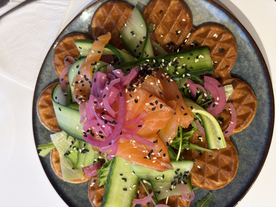 The scene depicts a close-up, overhead view of a prepared food dish on a table. The location is identified as Ramberg, Norway. **Subjects/Objects:** The primary subject is a circular, dark grey-blue speckled stoneware or ceramic plate with a slightly raised rim. The plate holds a meal composed of approximately nine heart-shaped or petal-shaped waffles, uniformly golden-brown with a distinct grid pattern, arranged in a circular formation at the base. Layered atop these waffles is a central mound of food. This mound consists of multiple thin, bright orange-pink slices of cured or smoked salmon. Interspersed with the salmon are numerous thin, vibrantly pink-purple slices of pickled red onion and elongated, thin slices of fresh green cucumber. A scattering of green leafy vegetables, consistent with arugula or lettuce, is visible beneath these elements. The entire top surface of the salmon, onions, and cucumber is generously sprinkled with both black and white sesame seeds. **People/Actions/Interactions:** No individuals are visible in the image. The scene portrays a static presentation of food. **Environment:** The plate rests on a smooth, light-colored surface, consistent with a white or off-white tabletop. A folded white textile, likely a napkin, is partially visible in the upper right quadrant of the frame, adjacent to the plate. The lighting is bright and even, suggesting an indoor setting.