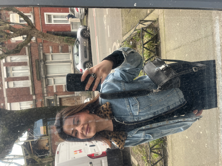 A young adult female is depicted in a mirror selfie, reflecting an urban street scene in Roubaix, France, under overcast daylight conditions. The female, positioned centrally, is shown from the waist up. She has medium brown, shoulder-length hair and is smiling faintly with closed lips. She wears a black long-sleeved top, a light blue denim jacket with a brown and black leopard print collar, and a black crossbody bag with silver-toned hardware slung over her left shoulder. Her right hand, adorned with a large, dark-stoned ring on her middle finger and a simpler silver-toned ring on her ring finger, holds a dark-colored smartphone, capturing the reflection. Her nails are manicured with a light polish. The immediate foreground of the reflection shows a concrete sidewalk and a narrow planter bordered by a black metal fence, containing sparse green vegetation and bare soil. The background, visible in the mirror's reflection, depicts a street with parked vehicles and multi-story brick buildings. On the left, a white commercial van with a red and orange "LOGISTA LOGISTIQUE" logo is parked. In the mid-ground, a grey Citroën C3 Aircross is parked parallel to the curb. Further down the street on the right, another light-colored compact car is partially visible. Across the street, traditional European brick buildings with white-framed windows and decorative architectural details line the street. One building on the far left appears to be in a state of renovation or partial demolition, exposing timber framing. Several deciduous trees with bare branches are present along the street, and ivy climbs a tree trunk on the right. A single individual in light-colored clothing is faintly visible in the far background on the right, appearing to bend over near a parked car.