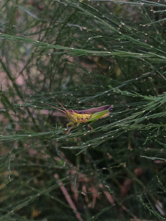 - "A medium-sized grasshopper, characterized by a chartreuse green head and ventral body and a dark purplish-brown dorsal side, is observed perched horizontally on a dense cluster of slender, needle-like green plant branches" by FM-JIY5u1, licensed under CC BY 4.0