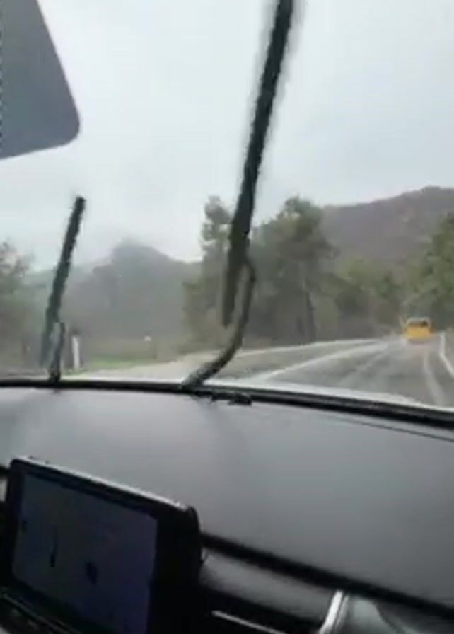 car's dashboard view while driving on a winding road. The weather is rainy, and the windshield wipers are active. Trees line both sides of the road, and mountains are visible in the distance, obscured by fog or low-hanging clouds. A yellow vehicle is visible ahead on the road. The car's dashboard includes a navigation screen and various controls. Music is playing.
