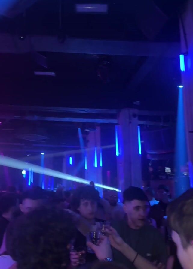 crowded nightclub with people dancing and drinking. The room is lit with blue and pink lights, and the music is loud. Several people are holding drinks, and one man has a cigar. The club appears to be well-attended, with people of varying ages and styles. The video’s quality makes it difficult to discern more detailed features.