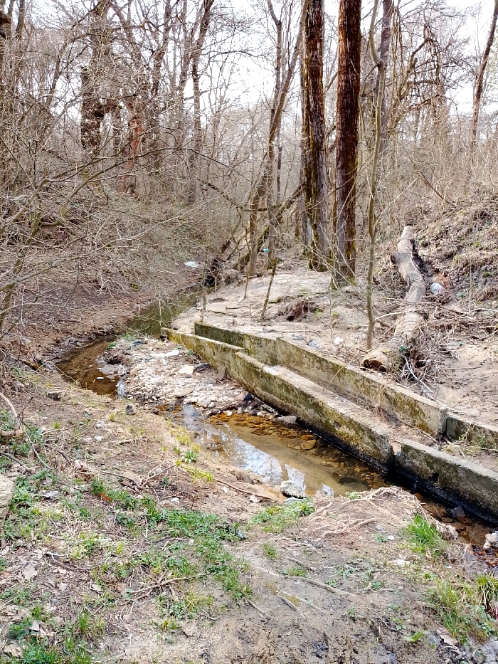 The image captures a natural, unkempt outdoor scene in a wooded area, location Unknown, Unknown. A narrow, shallow stream, approximately 1-2 meters wide, flows from the foreground towards the center-left background, exhibiting a muddy bed with visible rocks and sediment. Along the right bank of the stream, two parallel, weathered concrete structures, each approximately 0.5 meters high and extending several meters, run into the midground. These structures show signs of age, including moss growth and discoloration. To the right and behind these concrete structures, the ground slopes upwards, where a large, fallen tree trunk, roughly 3-4 meters in length, rests amidst dirt and sparse vegetation. The ground throughout the scene consists primarily of exposed dirt, scattered dry leaves, and patches of sparse green undergrowth. The background and midground are densely populated with numerous bare deciduous trees, indicating a late winter or early spring season. White plastic debris, including at least two plastic bags, is visible within the stream and on its banks. No individuals, animals, or observable actions or interactions are present in the scene.
