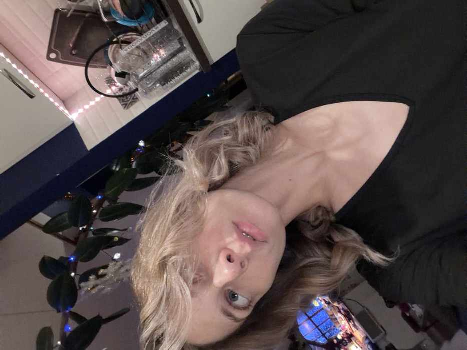 A woman with blonde, wavy hair and blue eyes is angled toward the camera. She's wearing a black top with a visible neckline. In the background, there's a table with various objects, including what appears to be water bottles and decorative lights. A plant with green leaves and additional lights is also visible. The overall scene is dimly lit.