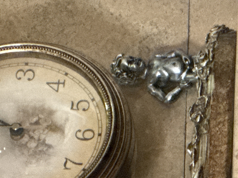 This image depicts an indoor scene in the city of Armavir, Armenia. The upper portion displays a partial view of a circular clock, featuring Arabic numerals 3, 4, 5, 6, and 7 on a light-colored, textured face. The clock is enclosed by a polished metallic bezel with a beaded edge and ornate patterns. Below and to the right of the clock, a small, silver-toned metallic statuette of a nude cherubic figure is prominently positioned. The figure has curly hair, a slightly open mouth, and stands with both hands resting on its lower abdomen. It is mounted on a rectangular base composed of a reddish-brown material, possibly wood or stone, which is adorned with metallic floral and scrollwork embellishments, specifically roses, along its top edge. The background consists of a uniformly textured, light brown surface. No human individuals are visible, and no actions or interactions are depicted.