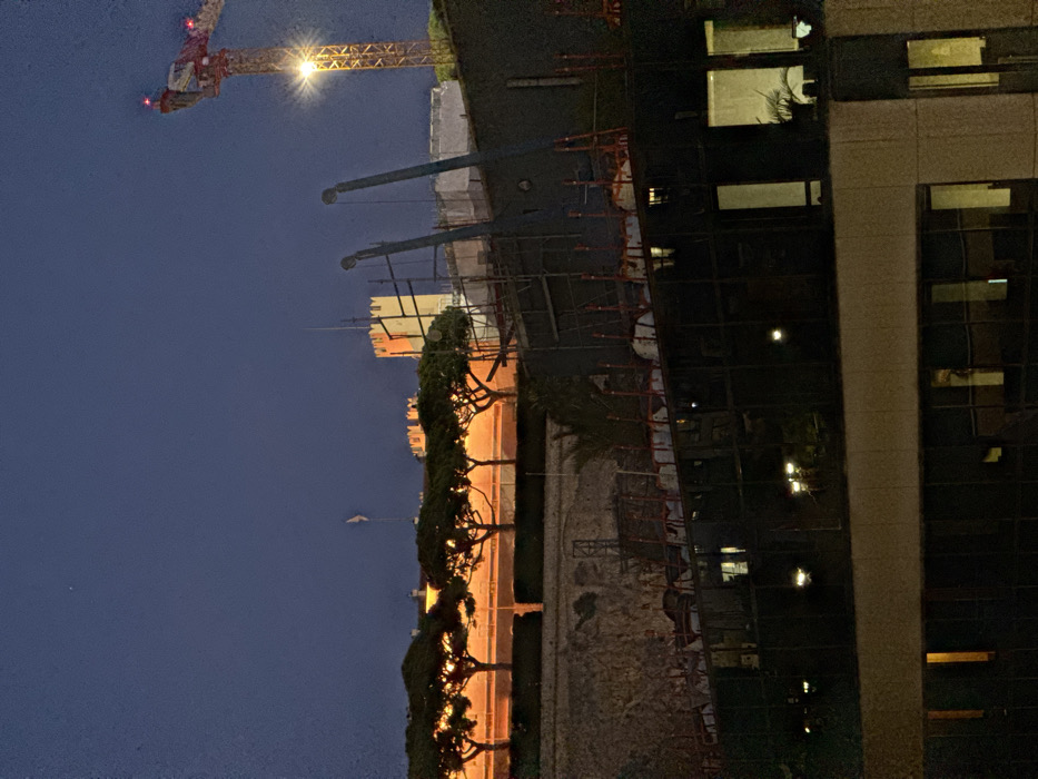 At night, a tall crane glows brightly in the sky above a cityscape. Adjacent to the crane, a building under construction is shrouded in scaffolding. Below, a line of trees with illuminated leaves flanks an old wall. To the right, a modern building stands tall with illuminated windows, reflecting the city lights. The sky overhead fades from dark blue to black.