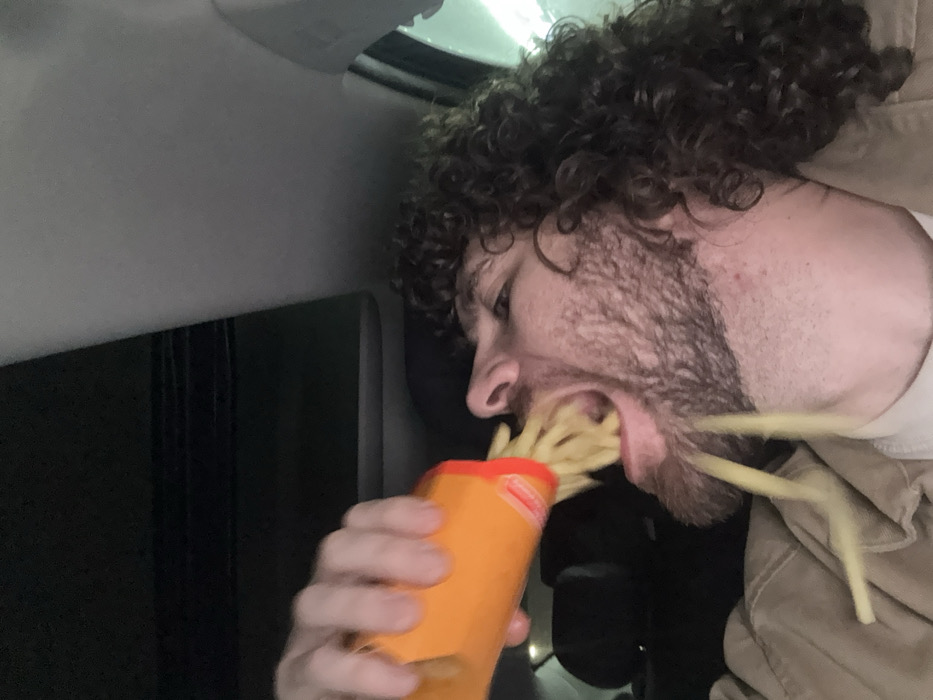 The scene takes place inside a vehicle, in the city of Pushkino, Russia. A male individual with dark, curly hair and a beard is shown in profile, actively consuming french fries. He wears a light-colored jacket over a white shirt. His right hand holds an orange container with a red rim, from which a large quantity of french fries is being directed into his widely open mouth. Multiple fries are visibly entering and overflowing from his mouth, with several observed falling downwards mid-air towards his chest. The vehicle's interior headliner is visible, along with a dark overhead opening consistent with a sunroof. The overall lighting is subdued.