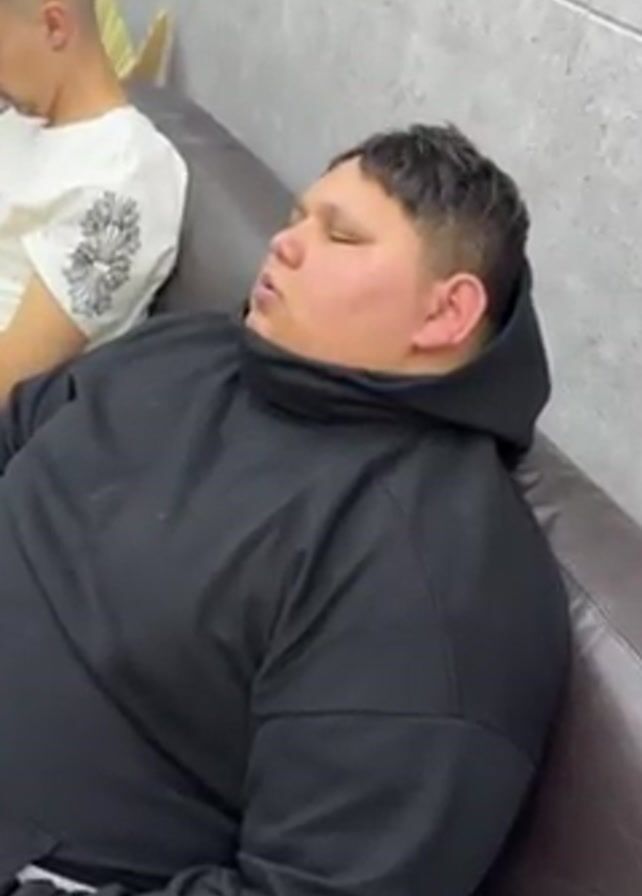 young man wearing a black hooded sweatshirt, asleep on a brown leather couch. He is on his side, facing toward the camera. Another person sits beside him, but is only partially visible. The room has light gray walls.