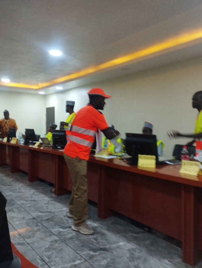 room in Ashaka, Nigeria (latitude: 10.929, longitude: 11.476). It depicts a row of wooden desks lined with computers and papers, a man in an orange shirt with a yellow vest standing behind a desk, another man in a similar orange shirt and vest standing behind him. There are also other people, mostly partially obscured by the desk, standing around the desks. The room is well-lit and the walls are white.