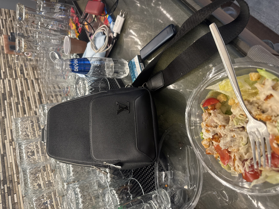 The scene depicts a dark countertop within a commercial establishment, identified as a bar or cafe in Pleven, Bulgaria. In the foreground, a partially consumed Caesar salad with chicken, croutons, and cherry tomatoes rests in a clear plastic container, with a metal fork positioned inside. An empty, clear plastic food container is located adjacent to it on the left. On the countertop, a black Louis Vuitton sling bag with its strap extending to the right is prominently displayed. Next to the bag, an open plastic bottle of "DEVIN" brand water, partially consumed, stands upright. Further to the right, a brown paper cup, a light blue microfiber cloth, a coil of white charging cables, a white USB wall adapter, and a red rectangular object are scattered. A pack of "TEREA" cigarettes and a dark blue/black IQOS device are also visible near the sling bag's strap. The background shows numerous clear glass cups and tumblers, some stacked and some inverted, arranged on a black ribbed bar mat. The wall behind the counter is covered with small, rectangular beige and brown mosaic tiles.