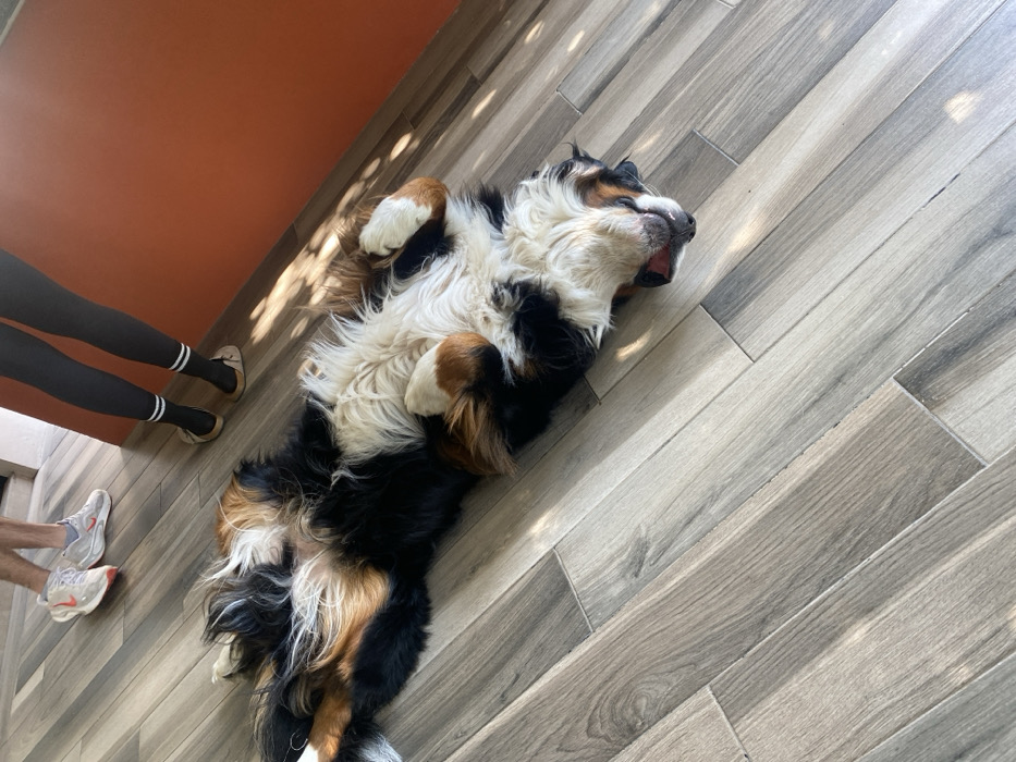 - "A Bernese Mountain Dog lies on its back on a gray, wood-like floor" by FM-TO6gh1, licensed under CC BY 4.0