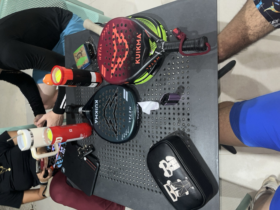 The image depicts an outdoor or semi-outdoor social gathering at night in Komchén, Mexico. The central focus is a dark gray perforated metal table laden with various items. Three individuals are partially visible. On the left, a person wearing a black short-sleeved top and dark red pants holds a smartphone. A gold chain is visible around their neck. Next to them is a large white insulated mug with a straw and a red cylindrical container labeled "W" and "X3," both containing yellow objects, likely tennis balls. Opposite, another individual wears a black long-sleeved shirt with white wrist stripes and blue shorts. Their left arm and right hand are visible. Near their hand, an orange ball is present. The table holds two padel rackets. The left racket is dark green/black, branded "KUIKMA METAL HYBRID," with a distinctive central tree-like perforation pattern. The right racket is red/black, branded "KUIKMA POWER METAL," featuring a chevron perforation pattern and green/yellow trim, with a red wrist strap. Additional rackets are stacked beneath the right one. Other objects on the table include a black tablet or laptop, a set of keys on a carabiner, a small white folded tissue, a purple metallic object (possibly a vape), a black cylindrical container topped with a yellow object (tennis ball), a green and brown wallet, and a pair of dark glasses. On the lower left of the table, a black rectangular pouch decorated with two white cartoon figures (Karl Lagerfeld K/Krew) is visible. Below the table, the legs of two individuals are seen. On the left, a leg with a light-colored athletic shoe and bright blue shorts or athletic wear. On the right, a hairy leg wearing dark patterned shorts. The floor is light-colored tiled. Artificial lighting illuminates the scene.