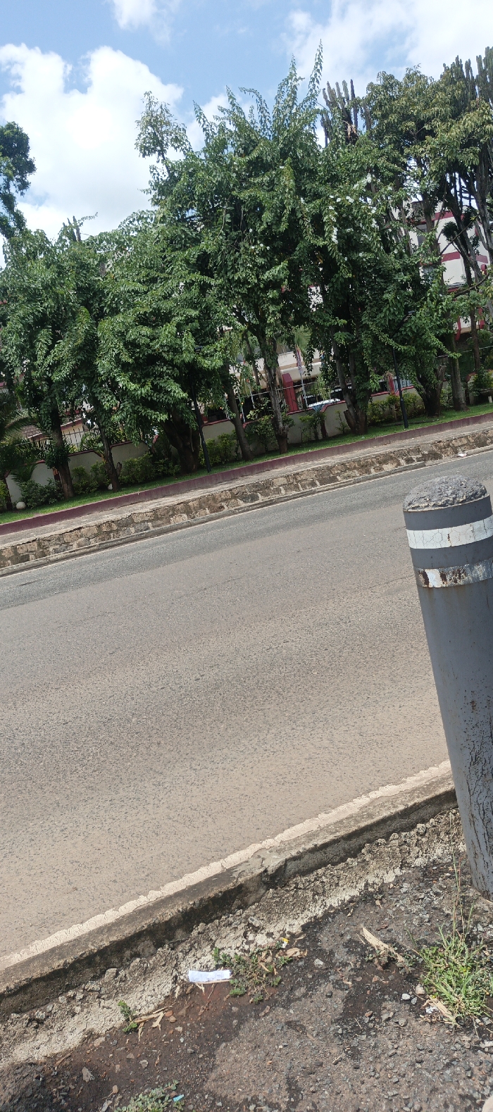 This image depicts a street scene in a well-landscaped area of Nairobi, Kenya, under a partly cloudy blue sky. In the immediate foreground, to the bottom right, a weathered cylindrical bollard, approximately 0.5 meters tall, is visible. It is painted grey with two faded, peeling white horizontal stripes near its conical top, showing rust and paint degradation. The ground immediately surrounding the bollard and bordering the road's edge consists of cracked dark soil and gravel, sparsely covered with green weeds and containing small pieces of white paper debris. The central subject is a paved asphalt road, appearing light grey and dusty, extending diagonally from the lower left to the upper right. The road surface exhibits a rough texture and minor wear. It is bordered on its left side by a raised concrete curb, approximately 10-15 cm high, also showing signs of weathering and discoloration. Behind this curb, a narrow strip of dark-colored, possibly stone or brick, edging is present. Beyond the edging and curb, a meticulously maintained green lawn strip is visible, approximately 2-3 meters wide. Behind this lawn, a dense row of mature trees with lush green foliage forms a prominent background element. Among these leafy trees, particularly towards the right side of the background, taller, slender, columnar plants resembling mature euphorbia are interspersed. Some white blossoms are discernible within the foliage of the main trees. Through and above the tree canopy, portions of a multi-story building are visible in the far background. This structure features white walls and distinctive reddish architectural elements, possibly roof sections or trim. No individuals, animals, or active vehicles are present in the scene.