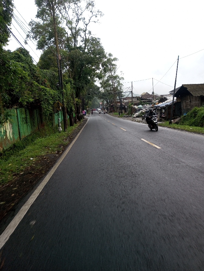 The image depicts a two-lane asphalt road extending into the distance under an overcast sky in the city of YonPhoogla, Bhutan. The road appears damp. On the immediate left, a weathered green wall is largely covered by dense green foliage, with multiple utility poles and overhead wires running parallel to the road. A narrow strip of dirt and grass separates the wall from a solid white line marking the road's edge. Further down the left side, several individuals are visible near the wall, and multiple vehicles, including cars and motorcycles, are present on the road. On the immediate right, the road's edge transitions to a dirt and grass shoulder, beyond which are numerous rustic structures with corrugated metal roofs, some appearing dilapidated. Piles of debris or various items are accumulated near these structures. A dark-colored motorcycle, ridden by an individual wearing a dark helmet and jacket, is traveling towards the camera, positioned in the right lane. Several utility poles with overhead wires are also present on the right side of the road. In the distance, broken yellow or faded white dashed lines separate the two lanes. The overall environment suggests a semi-urban or rural setting with active vehicular and pedestrian presence.