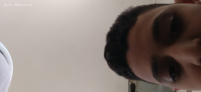 A vertically oriented close-up photograph depicts the left side of an individual's face, encompassing the forehead, dark, curly hair, eyebrows, and eyes, positioned along the left vertical edge of the frame. The subject exhibits a medium brown skin tone. The eyes are dark and appear open. A dark, narrow, rectangular object is partially visible in the upper-left corner, likely a structural element or frame. The majority of the right and lower portion of the image is occupied by a plain, light beige or off-white surface, consistent with an indoor wall or ceiling. In the upper-right corner, a curved white object with a distinct black edge is partially visible. A digital timestamp "22/10/2025 14:36" is embedded in the lower-right corner of the image. The depicted scene is reportedly located within the city of Barza Municipality, Syria.