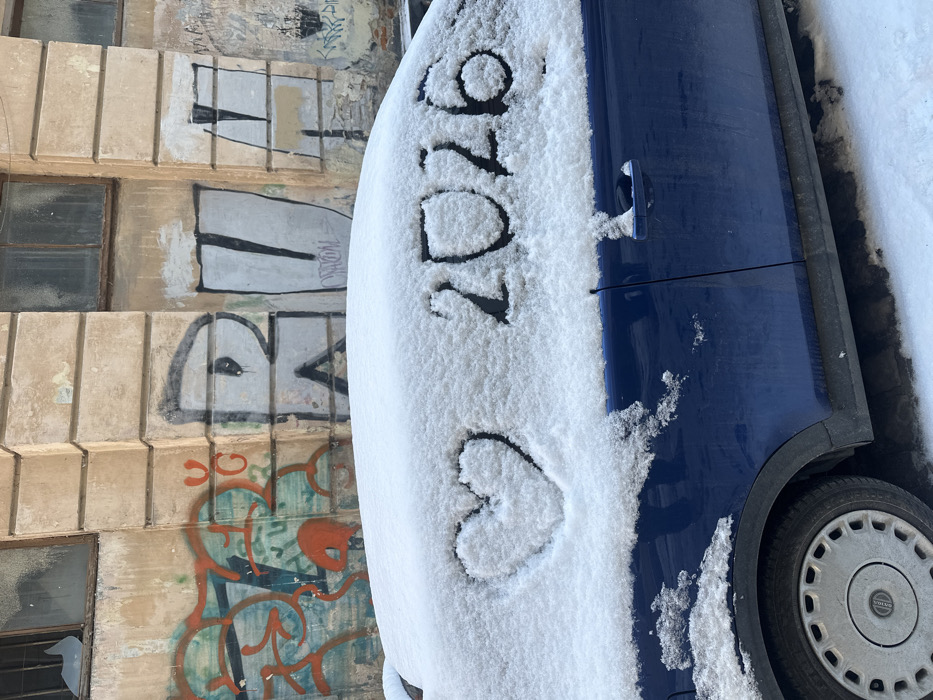 The image depicts a static urban winter scene in Lviv, Ukraine. In the foreground, the upper portion of a dark blue vehicle, likely a Volvo SUV given the visible hubcap, is covered in a layer of white snow. Etched into the snow on the vehicle's rear window or roof are a heart shape on the left and the numbers "2026" on the right, revealing the dark surface beneath. The car's driver's side front wheel with a silver hubcap and part of the passenger side front door are visible, also partially covered in snow. The ground directly beneath and around the vehicle is snow-covered. The background features a two-story, light brown or beige building with architectural details resembling columns or pilasters. The building's facade is extensively covered in various styles of graffiti. On the left, a prominent orange and green graffiti tag is visible. Towards the center and right, large, stylized black and white letters are spray-painted, partially obscuring the word "RAM." Multiple rectangular windows are visible; one on the upper left exhibits a broken pane. The overall environment suggests an older, urban setting during daylight hours, with no individuals present.