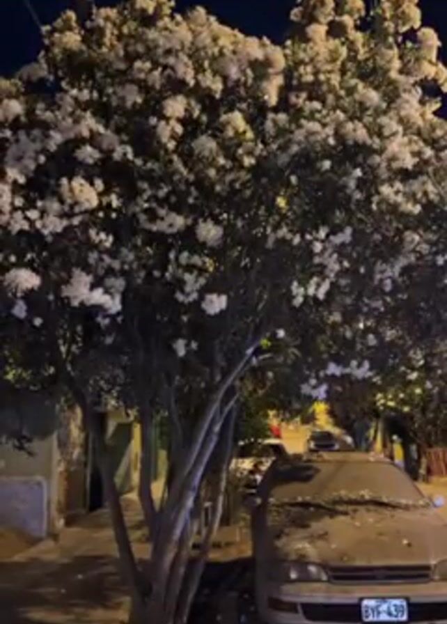 street scene at night. A tree with white flowers is the primary focus. A parked, dusty car is next to the tree. The street is lit by streetlights, and other cars are visible in the distance. A building is on the left side of the frame.