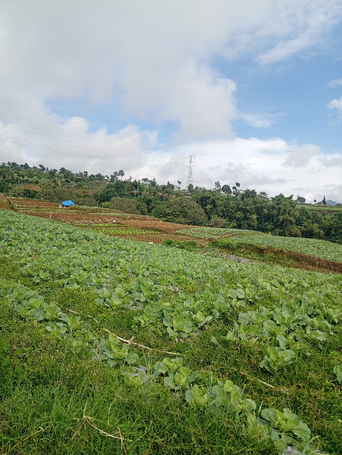 Rolling hillside farmland under a partly cloudy sky. Fields of cabbages and other crops are terraced up the slopes. A blue-roofed structure sits near the top. A powerline and transmission tower are visible against the sky. Trees are on the background.