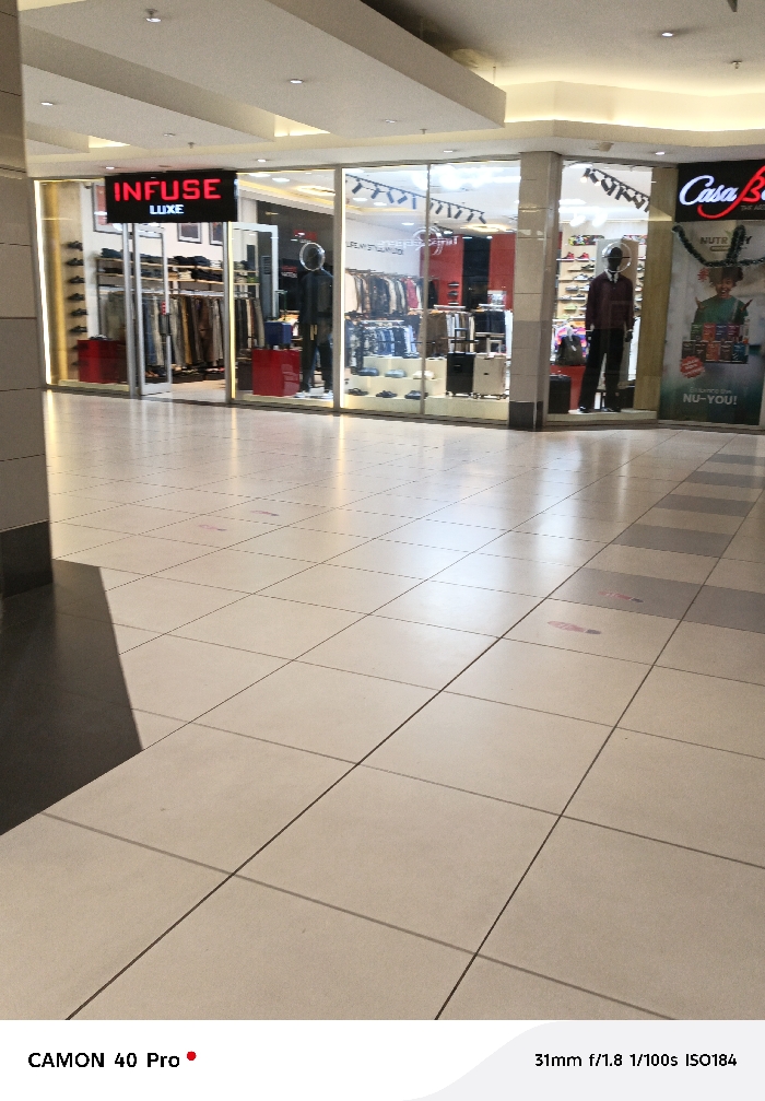 A brightly lit indoor shopping mall scene features two adjacent stores with prominent signage. The first store, "INFUSE LUXE," displays clothing racks and mannequins in its window. Next to it, "Casa B" promotes nutrition with a "NU-YOU!" campaign. The mall's tiled floor is spacious, reflecting overhead lighting and showing subtle pink markings. The image is captured with a "CAMON 40 Pro" camera, using a 31mm lens at f/1.8, 1/100s, and ISO 184.