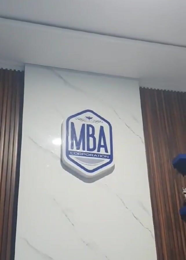 The camera pans upward from a logo for "MBA Corporation" mounted on a white marble-patterned wall