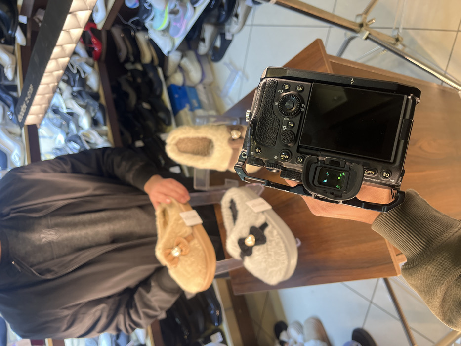 The image depicts an indoor product photography or videography session within a retail shoe store located in Al-Midan Municipality, Syria. In the foreground, a left hand wearing a grey-green ribbed sleeve holds a black digital camera, appearing to be a mirrorless interchangeable-lens model (likely a Sony Alpha series) equipped with a black protective cage. The camera's rear screen is dark, and the electronic viewfinder shows internal reflections. In the midground, a second individual, wearing a dark bomber jacket over a grey t-shirt with an emblem, holds up a beige, plush slipper adorned with a tan flower and a white pearl. This slipper is positioned above a dark brown wooden display surface. On the same wooden surface, a grey-white plush slipper with a black bow and a gold-colored heart is displayed on a clear acrylic stand. To the right, another beige plush slipper with a brown bow and a pearl is partially visible, also on a stand. The background consists of multiple wooden shelves fully stocked with various footwear, including high heels, flats, and athletic shoes, arranged in rows. A black rectangular LED light panel, labeled "Doctor Z-600," is mounted above a section of the shelves on the right. The floor is a light-colored tile, and a silver-colored tripod leg is visible on the far right. The overall scene suggests a commercial photoshoot setup for the displayed slippers.