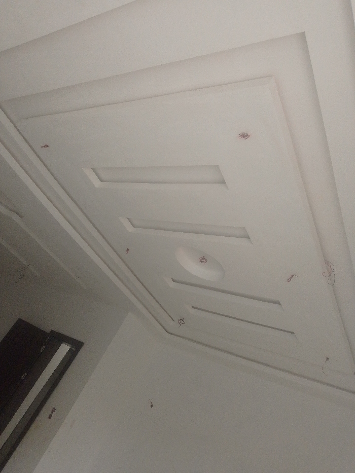 The image displays the interior of a room located in Alor, Nigeria. The primary subject is a white, multi-layered plaster of Paris (POP) false ceiling. This ceiling features a central rectangular panel containing a circular recessed dome, flanked by two elongated rectangular indentations. Multiple stepped tiers define the ceiling's perimeter. Numerous loose, thin red electrical wires, some coiled, protrude from various points on the ceiling, indicating uninstalled light fixtures. Faint alphanumeric markings, such as 'S', '2', and 'L', are visible near some of these wire outlets. The visible walls are uniformly white and appear recently painted. In the lower-left corner, a dark brown wooden door with a rectangular glass panel is partially visible, set into a white wall. No individuals, furniture, or personal effects are present in the scene. The environment suggests a recently constructed or renovated space awaiting final fixture installation.