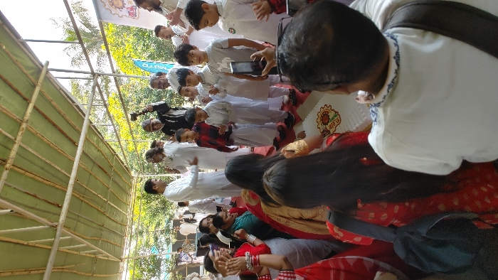 A group of people gathers outdoors. Several children dressed in white stand in a line, some holding phones to take photos. Adults are scattered throughout the scene, some also taking pictures. A bamboo structure is visible in the background, and trees and foliage are seen further away. The overall lighting is bright and sunny.