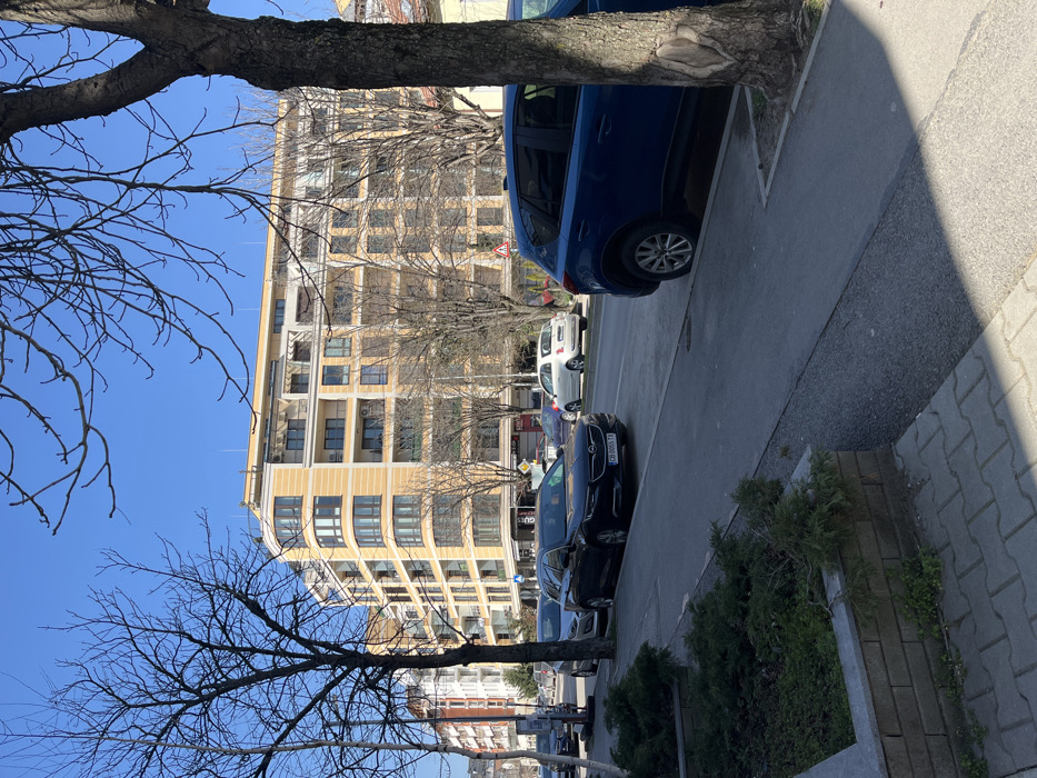 The image depicts an urban street scene in Sofia, Bulgaria, characterized by parked vehicles and architectural structures under a clear blue sky. In the foreground, a raised rectangular planter box constructed from grey concrete blocks contains evergreen shrubs on the left. Adjacent to it is a grey paver sidewalk. To the right, a tree trunk partially obscures the front passenger side of a blue SUV. Bare tree branches extend into the upper right portion of the frame. The midground features a street with several parked vehicles. A dark grey/black Opel Insignia station wagon with Bulgarian license plate "CB 0055 TX" is parked parallel to the curb. The aforementioned blue SUV is parked perpendicularly, partially on the sidewalk area. Further down the street, additional vehicles are visible, including a white Fiat 500, a silver sedan, and other dark-colored sedans. Numerous deciduous trees with bare branches line the street, suggesting late winter or early spring conditions. A red triangular road sign is partially visible in the distance between cars. In the background, a prominent multi-story building with a yellow-cream facade and numerous windows, many with dark frames, and balconies is central. This building features a distinctive rounded corner. To its left, other multi-story buildings with white and red-brown facades are visible. No individuals are discernible in the scene. The overall environment is dry and illuminated by direct sunlight, casting shadows towards the right.