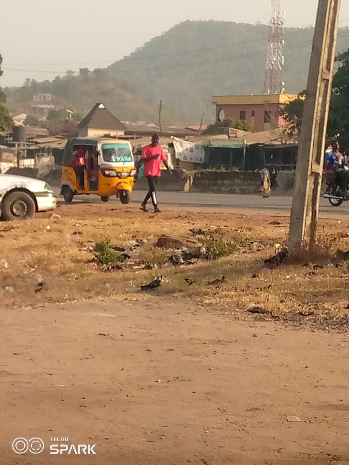 A vibrant yellow auto rickshaw, or tuk-tuk, sits at the roadside near a white car. A man in a pink shirt and black pants walks by. Behind them is a low concrete barrier with structures and buildings of varying styles and colors. Further in the distance are a hill, a tower, and a light-colored building. The foreground is a patch of dry grass and dirt with scattered debris. A power pole stands on the right.