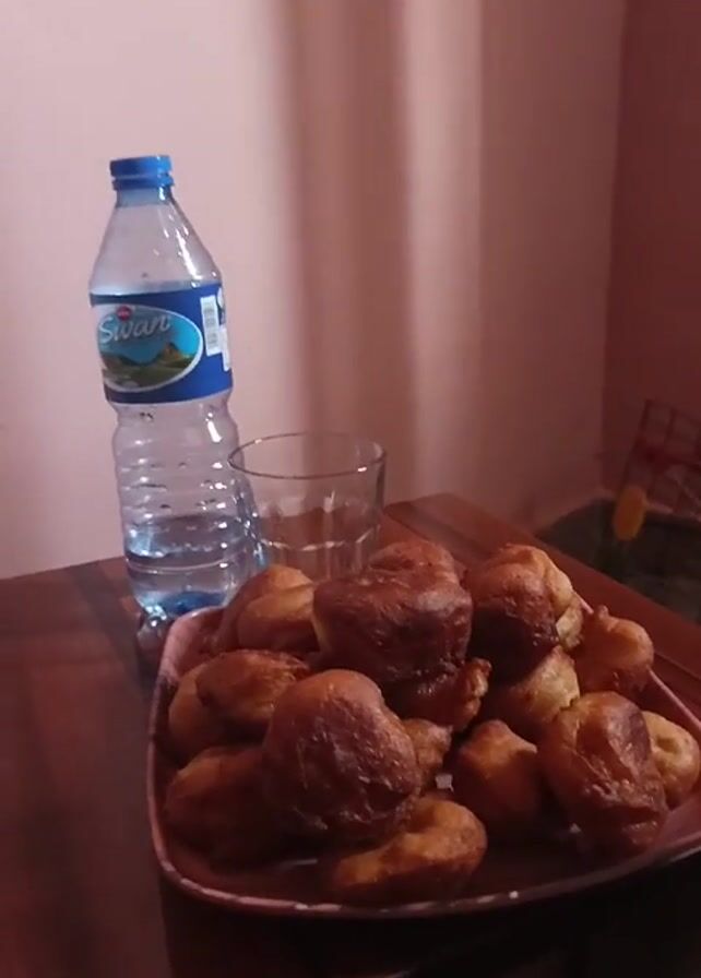 The scene features a wooden table with a plate of what appear to be fried doughnuts or similar pastries. Beside the plate is a glass and a bottle of Swan brand bottled water. The table is set against a light pink wall. A small, obscured object is visible in the background near the corner of the room. The camera slowly pans around the arrangement on the table, focusing on the pastries, glass, and water bottle.
