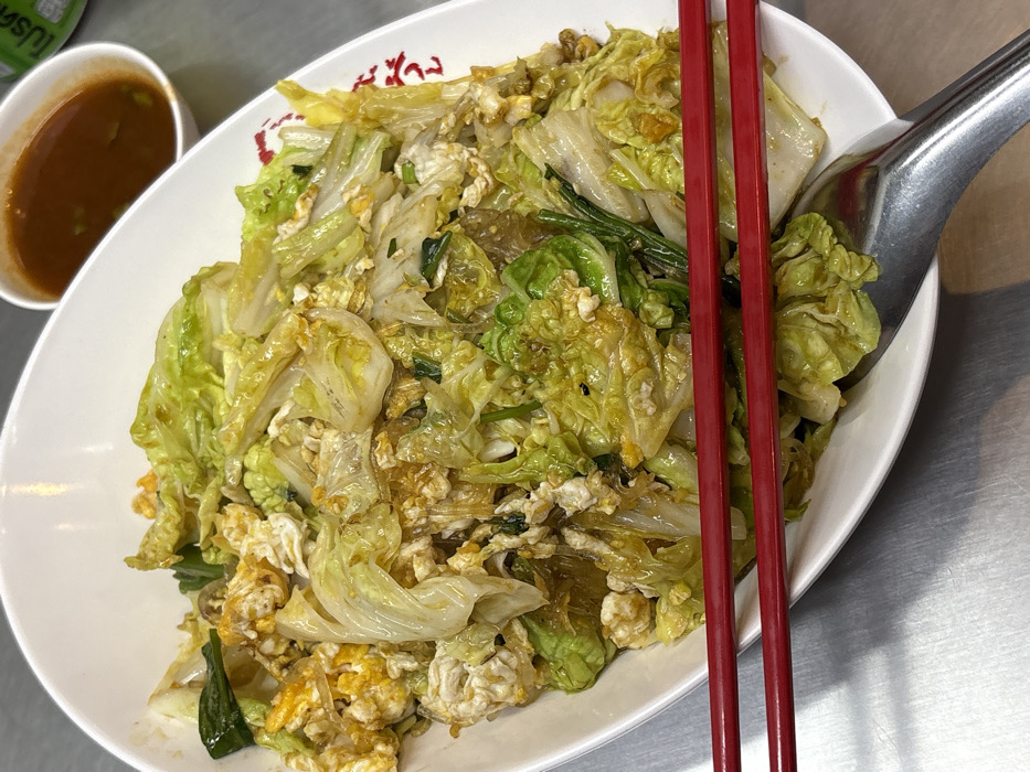 A white oval bowl, featuring a red script design on its rim, contains a serving of stir-fried vegetables and scrambled egg, with translucent noodles interspersed. The primary vegetable appears to be Chinese cabbage, exhibiting varying shades of light green and yellowed-white. A pair of red chopsticks rests horizontally across the top of the bowl. A metallic spoon is partially visible beneath the chopsticks on the lower right side of the bowl. In the upper right background, a small white bowl holds a reddish-brown sauce with subtle green flecks. The items are situated on a brushed metal table surface. A blurred green object with white Thai script is partially visible in the far upper right background. The scene is located in Suthep, Thailand. No individuals are present or engaged in direct action within the frame.
