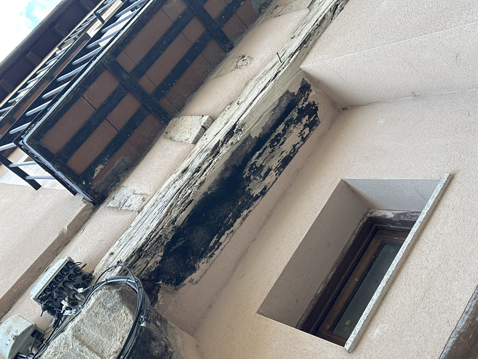 close-up of a building's exterior in Segovia, Spain, located at 40.95 latitude and -4.124 longitude. The building's wall is painted a light beige, and a wooden beam, weathered and stained with dark streaks, runs along the upper portion of the wall. The beam is positioned directly above a window, which is set into a recessed square frame. The window is partially visible, with a dark wooden frame surrounding a pane of glass. A black iron railing extends from the top of the image down the right side, partially obscured by the beam. There are also electrical wires and boxes attached to the wall. There are no people present. The scene is a typical example of the aging architecture commonly found in Spain, with its history and weather leaving their mark on the building's surfaces.
